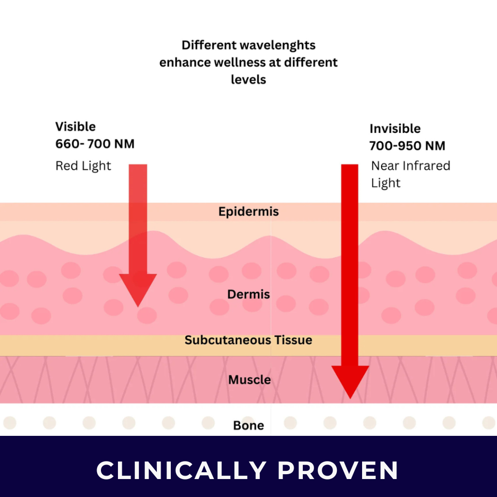 The Themytom Pro Light Therapy Belt works by delivering red and near-infrared light directly to the body through a flexible, wraparound design that sits comfortably against the skin. Red light supports surface-level comfort and skin health, while near-infrared light penetrates deeper into muscles, joints, and surrounding tissue to support circulation and recovery.